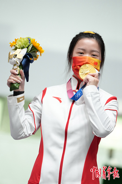 7月24日,日本东京朝霞射击场,2020东京奥运会女子10米气步枪决赛颁奖现场,夺得本届奥运会首金的杨倩隔着口罩“亲吻”金牌。