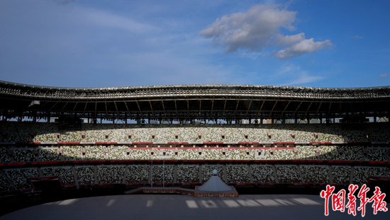 7月23日傍晚,日本东京新国立竞技场内,一片椭圆形阳光照在空旷的观众席上。当晚,因新冠肺炎疫情延期的2020东京奥运会在这里开幕。