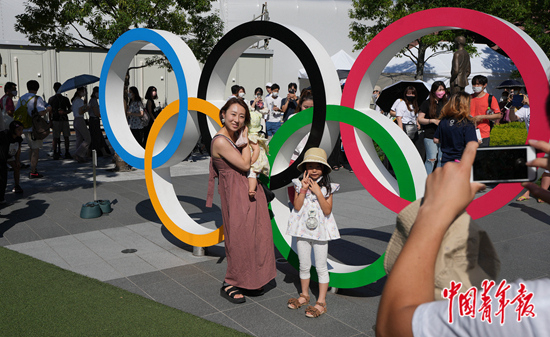 奥运会期间,东京的气温一直居高不下,在举办开幕式和田径比赛的东京新国立竞技场外,一个奥运五环标志成为市民的打卡地,无法入场观看比赛的人们顶着烈日排着长队,就为了能跟五环合个影。