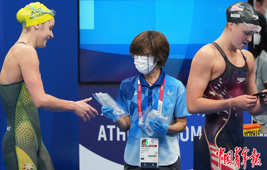 7月31日,2020东京奥运会一场游泳比赛结束后,工作人员立即向运动员递上口罩。