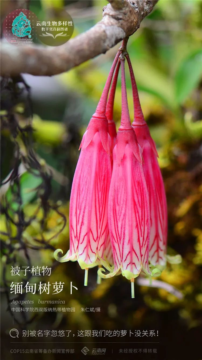 当你看到一串艳红的花朵倒挂在枝头时,无论如何,你都没法把它和萝卜联系在一起。那么为什么会取这样的名字呢?这是因为它的根膨大成块状,尤其是雨季的时候,特别像脆生生的大萝卜,让人忍不住想吃一口,不过不建议尝试,它跟我们常吃的隶属十字花科的大萝卜可以说毫无关系,而且其根已木质化,除非想体验一下啃木头是啥滋味。