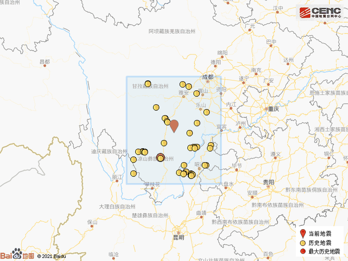 历史地震:根据中国地震台网速报目录,震中周边200公里内近5年来发生3级以上地震共89次,最大地震是2018年10月31日在四川凉山州西昌市发生的5.1级地震(距离本次震中132公里),按震级大小前50次历史地震分布如图。