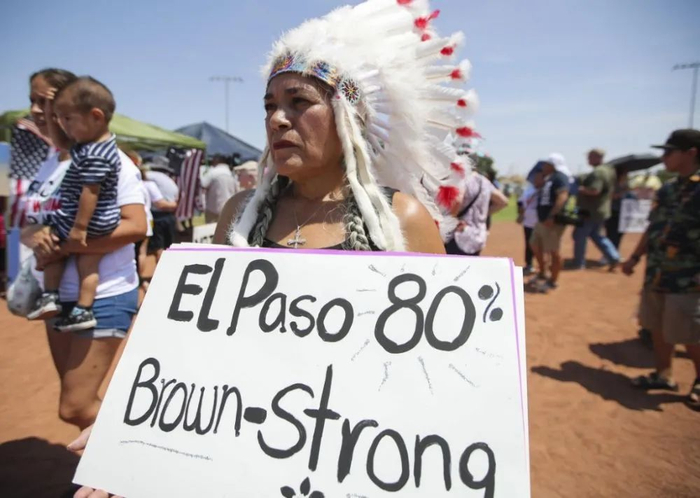2019年8月7日,在美国得克萨斯州埃尔帕索市,印第安裔美国人普丽西拉·佩雷斯手举标语参加反种族主义集会。(新华社记者 王迎 摄)