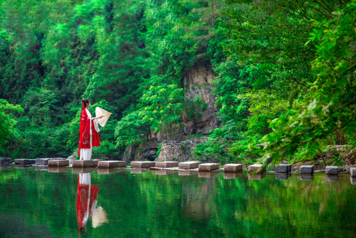鸳鸯潭、四叠瀑布、碧玉潭、龙门潭……处处有水的“留情”。一处处探寻,随着峡谷越来越狭窄,溪水在石头间穿梭,一会潺潺白绢不见踪影,只听见地下淙淙水声如琴似瑟。