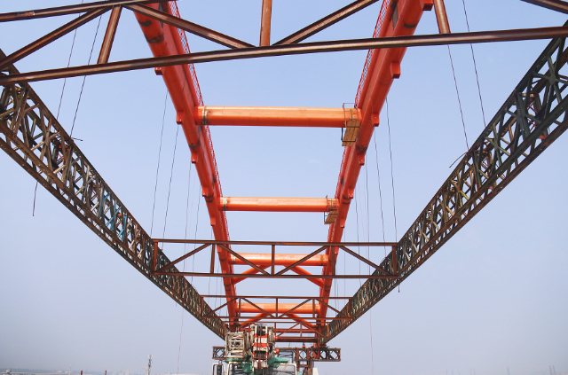 据中铁十四局项目部技术负责人介绍,由于受施工环境影响,128米连续梁拱上跨京石高速公路和卢沟桥南路,车流量大,为了使连续梁拱在施工过程中减少对高速公路的干扰,确保高速公路运营安全,采用在相邻的桥面上拼装钢管拱。将钢管拱拆分成五节段,采用2台350吨吊车吊装对称拼装成型,同时在梁面铺设两组四条轨道,采用连续拖拉的方法,选用2台250吨的连续千斤顶向前牵引,同时利用卷扬机在后方进行防溜,将钢管拱整体缓慢纵移240米就位。管拱拖拉到位后,采用三向千斤顶对钢管拱各方位进行精调,拱脚修正到位后与拱座预埋段焊接合龙,再进行浇筑拱座混凝土、拆除临时拱座,最后进行拱肋注浆,吊杆安装及张拉。