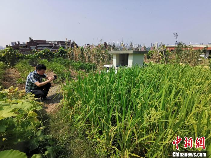 8月6日,重庆两江新区童心青禾小学校长秦波在楼顶拍摄水稻。 张旭 摄