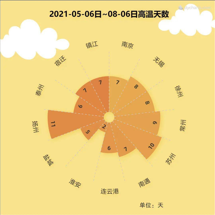 @江苏气象用数字说话,自常州5月6日最早一批入夏以来,截至昨天,扬州高温日数全省最高,为11天,而淮安只有2天;与去年同比高温日数有所下降。这期间江苏的最高气温38.6℃,出现在常州溧阳(7月14日)。