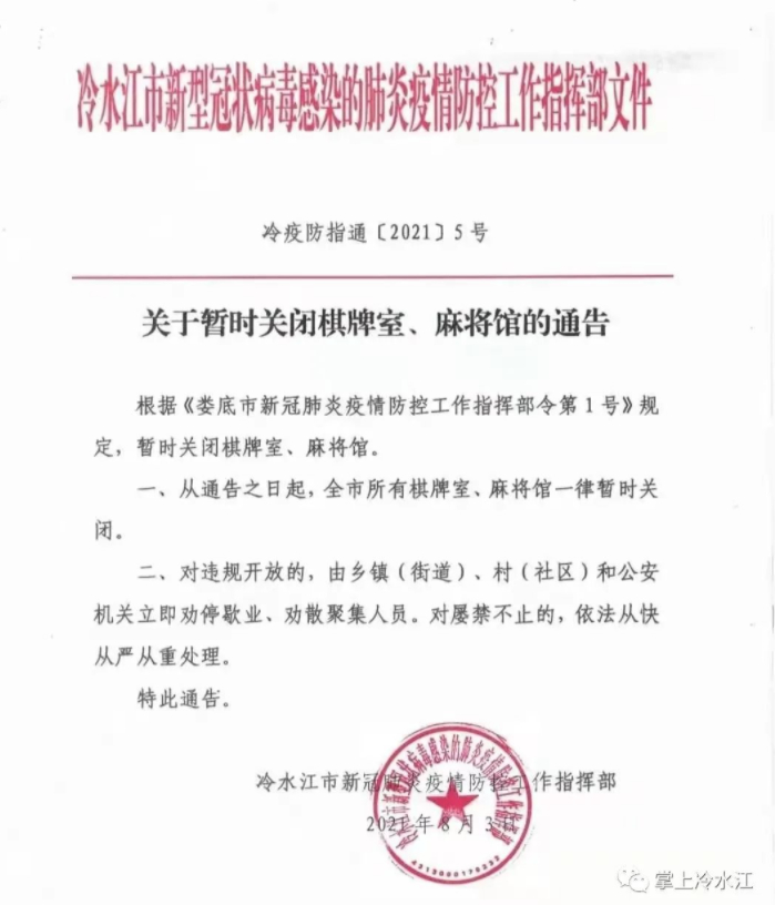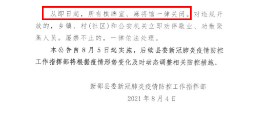 从8月3日起,全市所有棋牌室、麻将馆一律暂时关闭。
