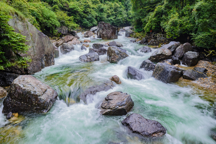 牯牛降位于安徽石台县与祁门县交界处,主峰海拔1728米,以雄、奇、险著称,因山形酷似一头牯牛从天而降得名。在当地有一句民谣:“三十六大岔,七十二小岔,岔岔环连环,大岔套小岔。”说的便是牯牛降的36大峰和72小峰,足以见得这里地势的雄险。再加之牯牛降降水量充沛,一路水随山行,使得这里的水格外富有生机。顺瀑而下的溪流碧绿清澈,时深时浅,时缓时急,在山间林里穿行,每遇凹处,则形成一个个大小不一的清潭。