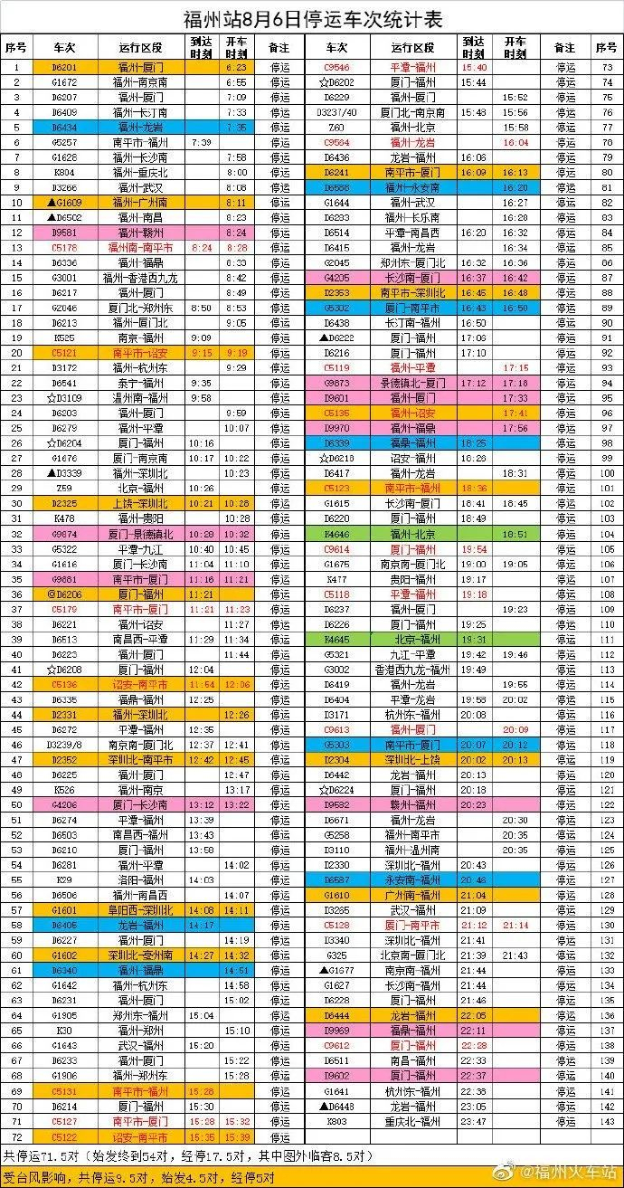 受今年第9号台风“卢碧”的影响,截至6日早上8时30分,福州火车(南)站停运车次统计表如下: