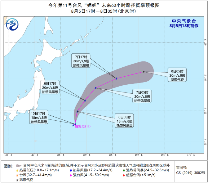 今年第11号台风“妮妲”(热带风暴级)的中心今天上午8点钟位于距日本东京偏东方大约900公里的日本以东洋面上,就是北纬35.2度、东经149.6度,中心附近最大风力有8级(18米/秒),中心最低气压为998百帕,七级风圈半径为180-250公里。
