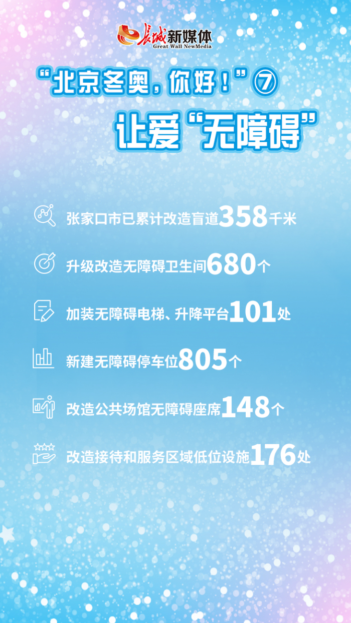 同样是在3月,张家口市荣获“创建全国无障碍环境示范市”称号。据了解,截至目前,张家口市已累计改造盲道358千米,升级改造无障碍卫生间680个,加装无障碍电梯、升降平台101处,新建无障碍停车位805个,改造公共场馆无障碍座席148个,改造接待和服务区域低位设施176处,改装宾馆、酒店无障碍客房83个,建设无障碍公共服务网站38个。