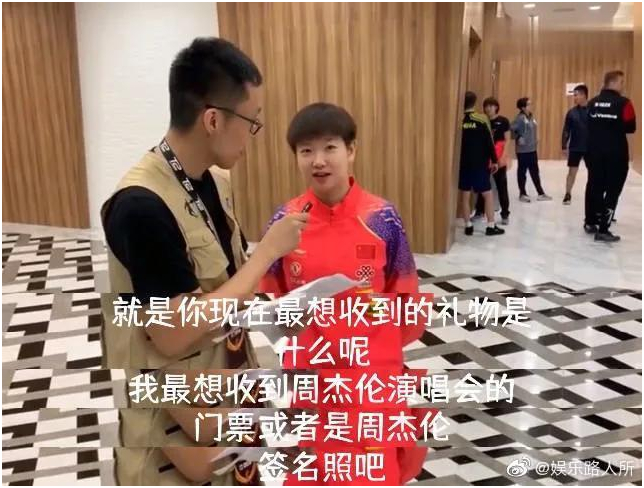 2019年,孙颖莎就在接受采访时说最想收到的礼物是周杰伦演唱会的门票,或者周杰伦签名照↓
