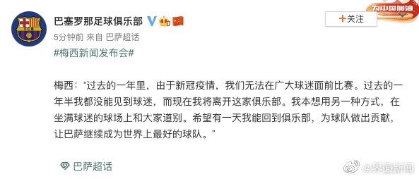 据@巴塞罗那足球俱乐部 微博消息,北京时间8月8日18时,阿根廷球星莱昂内尔·梅西在诺坎普球场召开发布会,向巴萨球迷告别。梅西表示,“过去的一年里,由于新冠疫情,我们无法在广大球迷面前比赛。过去的一年半我都没能见到球迷,而现在我将离开这家俱乐部。我本想用另一种方式,在坐满球迷的球场上和大家道别。希望有一天我能回到俱乐部,为球队做出贡献,让巴萨继续成为世界上最好的球队。”