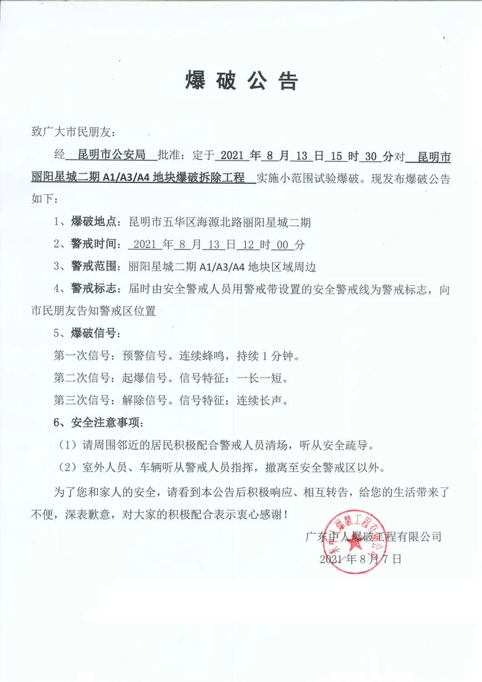 值得一提的是,广东中人爆破有限公司就是老昆明市政府大楼、老工人文化宫大楼爆破施工方,曾经圆满完成昆明两栋标志性建筑的爆破拆除。