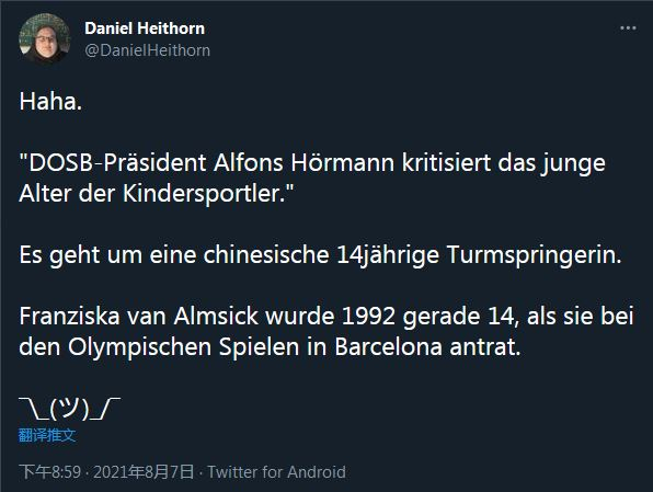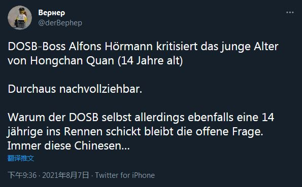 “德国奥委会主席霍曼批评全红婵14岁的年龄太小,这可以理解。但为什么德国奥委会自己派出了一名14岁的运动员参加比赛,这仍是个问题。总是这些中国人(受到批评)。。。。。。”