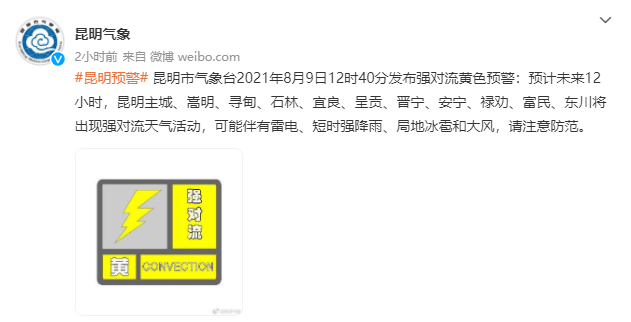 9日12时40分,昆明市气象台发布强对流黄色预警:预计未来12小时,昆明主城、嵩明、寻甸、石林、宜良、呈贡、晋宁、安宁、禄劝、富民、东川将出现强对流天气活动,可能伴有雷电、短时强降雨、局地冰雹和大风,请注意防范。