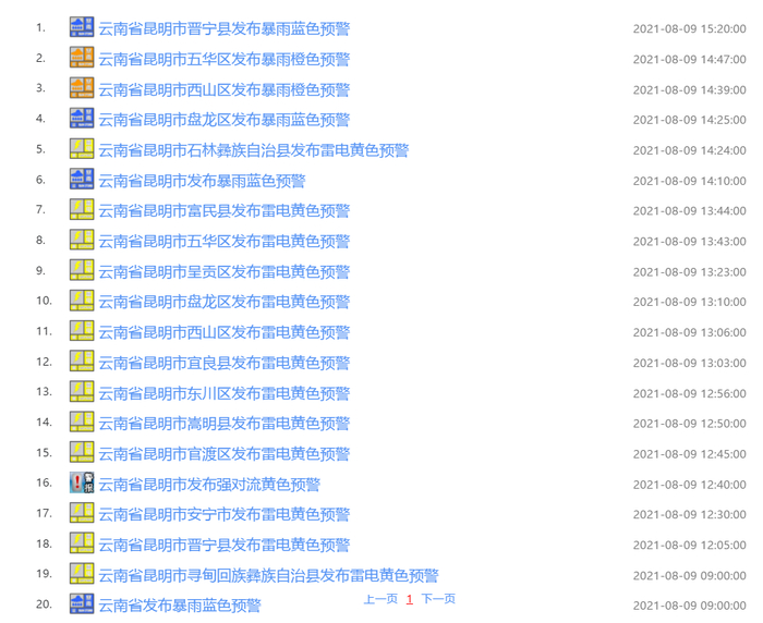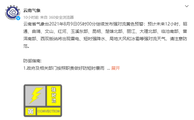 此前,云南省气象台已于9日5时、9时分别发布强对流黄色预警、暴雨蓝色预警:预计未来12小时,昭通、曲靖、文山、红河、玉溪东部、昆明、楚雄北部、丽江、大理北部、临沧南部、普洱南部、西双版纳将出现雷电、短时强降水、局地大风和冰雹等强对流天气,请注意防范。