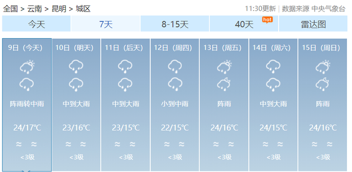 9日14时10分,昆明市气象台发布暴雨蓝色预警:预计未来12小时,昆明主城、呈贡、富民、嵩明、晋宁、安宁将出现暴雨。请注意防范强降雨引发的道路积水、山洪、滑坡、泥石流等灾害。