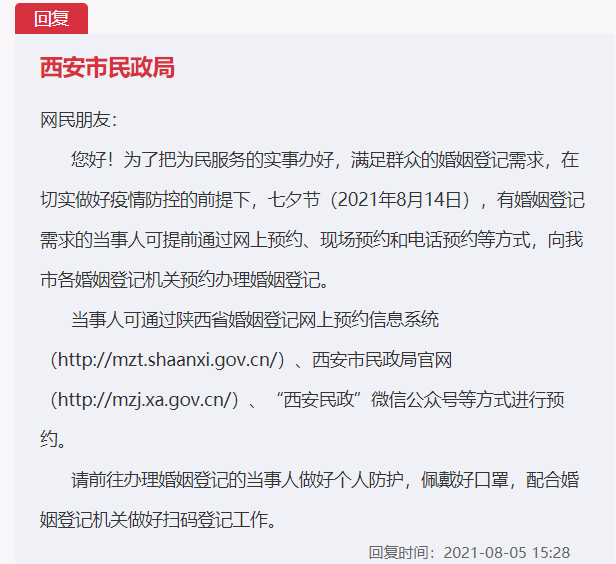 “2021年8月14日是七夕节,我和未婚妻准备在当天领证,但刚好赶上星期六,民政部门休息。”近日,陕西西安市民岳先生在人民网“领导留言板”留言,希望当地民政部门能综合考量,在七夕当天开放婚姻登记业务。