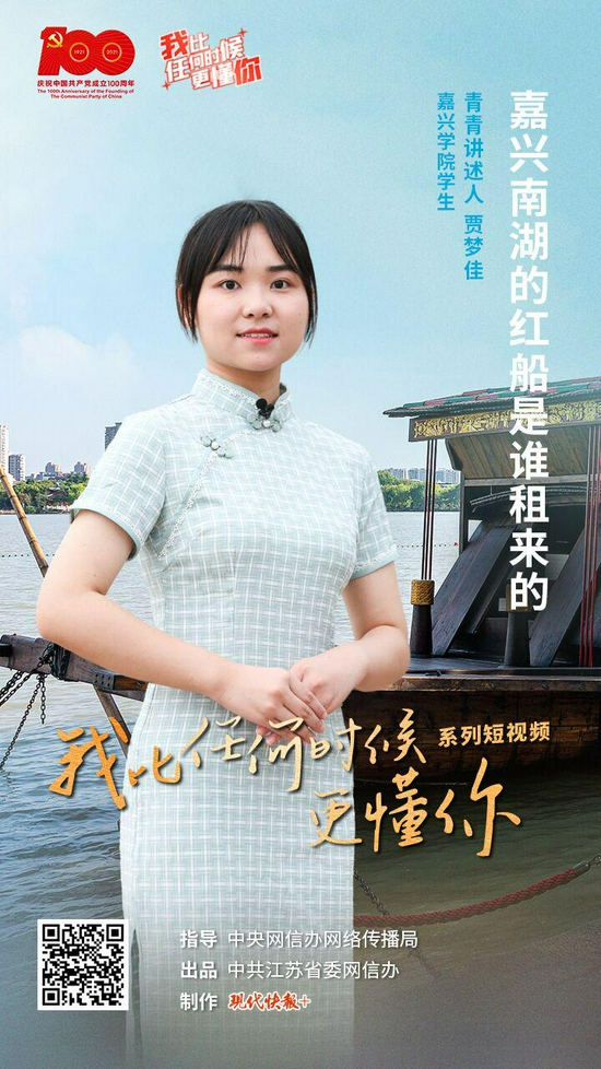 8 月 9 日," 我比任何时候更懂你 " 系列短视频第 16 集《嘉兴南湖的红船是谁租来的》上线,本集青青讲述人是嘉兴学院学生贾梦佳。曾经在学校话剧《初心》中饰演王会悟的她,为大家带来了红船的故事。