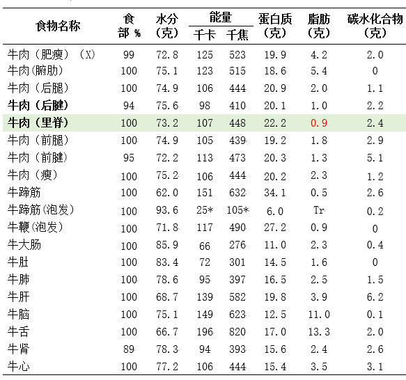 牛肉各部位三大产能营养素含量表