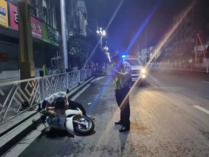 无独有偶,凌晨5时许,在该县安阳镇屏山大道,一辆电动车翻倒在路边,一男子则趴在车上。不时有车辆从旁边驶过,情况比较危险,有热心群众拨打了报警电话。