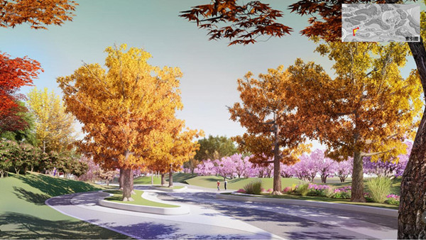 画卷:长达940米的樱花坡地,未来是剑川路的一道城市风景线,公园主出入口就在其中心位置。