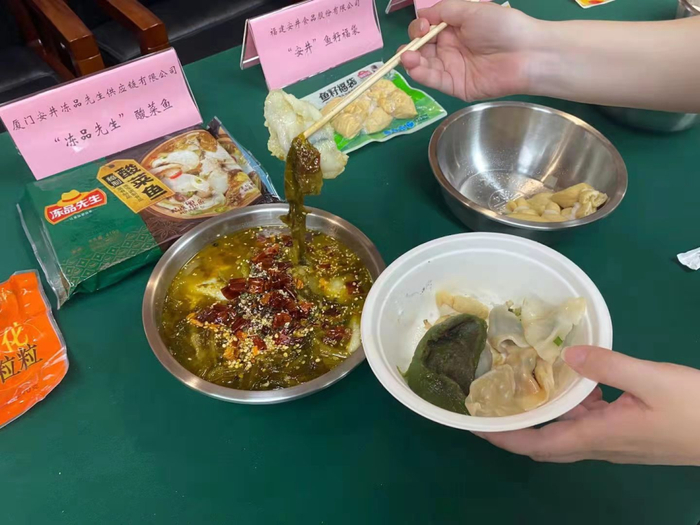 在冷链端具有先天优势的“安井”,此次研讨会便带来了速冻酸菜鱼产品,鱼片采用活鱼现杀,急冻锁鲜工艺;酸菜选用霜降后的芥菜,古法老坛泡制经九九八十一天以上的封存发酵工艺,还原食材本色,菜品酸度适中、质地脆嫩、加工简单,可广泛用于家庭、餐饮,方便快捷;“金路易”的雪花鸡排则是完美复制了小吃摊上现场制作大鸡排口感,通过特别研制的雪花脆片融合经典裹粉,在原有裹粉脆壳上可感受出颗颗脆片带来的双倍劲爽,配合鲜嫩多汁的一整片调味鸡胸肉,让脆、嫩两种口感更加突出;“亚明”的荷叶糯米鸡将精选优质鸡肉、香菇、猪肉等馅料,放入颗粒饱满的糯米中,调配风味酱料,以荷叶包实,蒸熟后拆开荷叶,肉香、糯米香、荷叶香完美融合,香气扑鼻。