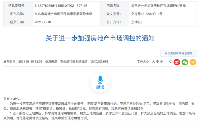 8月10日,浙江省义乌市住房和城乡建设局发布《关于进一步加强房地产市场调控的通知》,自通知发布之日起,所有新取得预售许可(含现售)商品房项目的住宅销售,实行“公证摇号”,即采取公证摇号排序选房的销售方式。同时,调整住宅限售政策,凡在义乌区域新购买的新建商品住宅和二手住宅,在取得《不动产权证》满3年后方可上市交易。