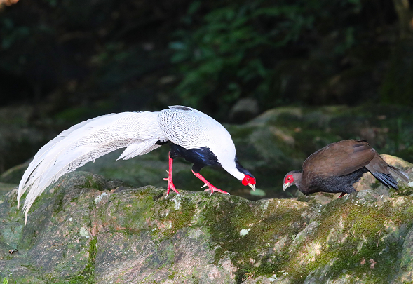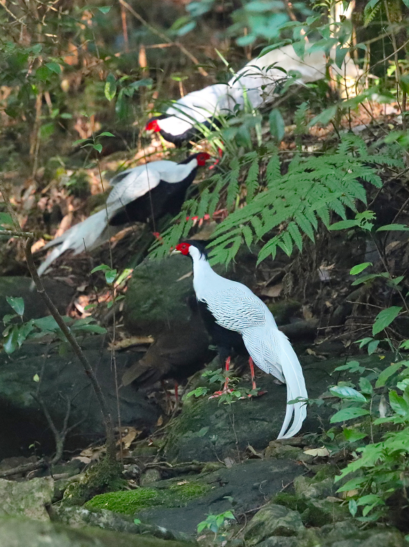功夫不负有心人,终于,4号下午,白鹇出现了!先是一只雄鸟走出来,感觉周围比较安全,把雌鸟也叫出来。觅食的时候,雄鸟先扒拉扒拉树叶,找到食物给雌鸟。雌鸟吃的时候,雄鸟负责警戒。雌鸟吃完,雄鸟才吃。