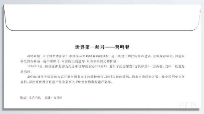 (自主开发的鸡鸣驿特色纪念封,由国家邮政邮政集团公司邮票印制局印刷,并加盖纪念戳及1995年8月发行的《古代驿站·鸡鸣山驿》纪念邮票一枚,可以邮寄远方亲人好友,传达问候,也可收藏)