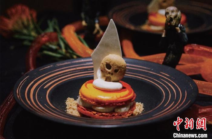 “这份甜点的名称是‘颅内剧场’,根据爱德华·蒙克《呐喊》设计而来。”在一层的用餐区域,廖青为两位年轻的顾客端上一个带有红色漩涡纹的黑色圆盘,盘里的甜品造型独特,最上方是一小块扭曲人脸形状的花椒饼干,“人脸”下方是两块带有红色和橘黄色纹路的马卡龙,中间则夹着香蕉腐乳芝士。“这种搭配真的可以吗?”听到廖青的讲解,顾客瞪大双眼。