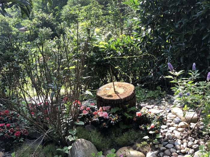 十八棵水杉树影婆娑,一棵无花果结上了果子,知了大声鸣叫,一只小松鼠敏捷地在树林间窜来窜去。盛开的红色小叶杜鹃、金黄的黄金菊、红色和黄色的美人蕉等摇曳生姿。地上,两只毛虫正在啃食堇菜……