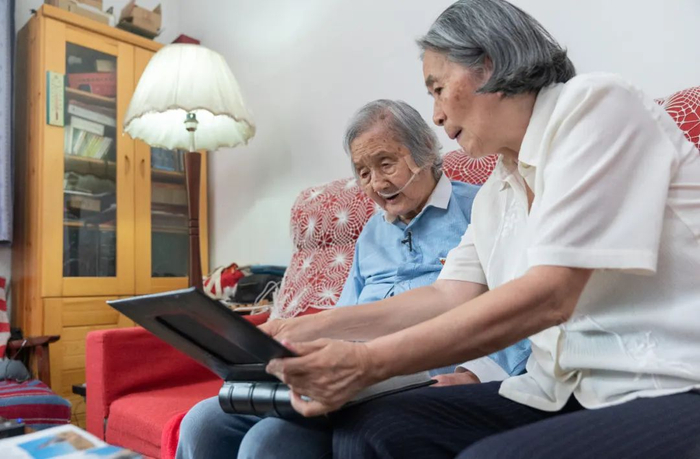 瞿独伊(左)和女儿李晓云向记者展示家人的相册。才扬摄(新华社)