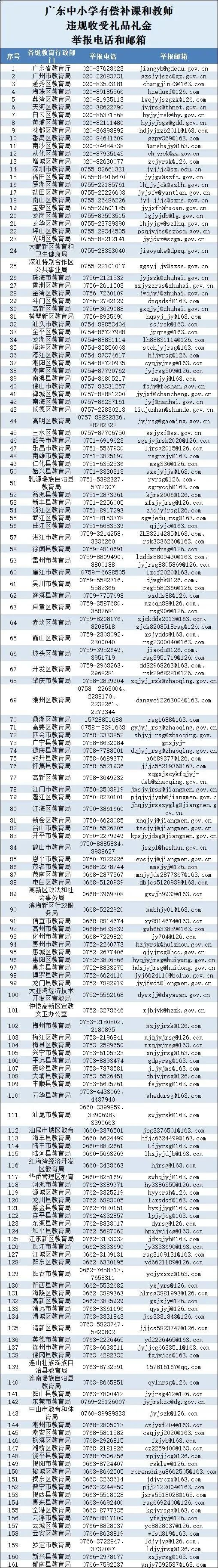 8月11日,广东省教育厅公布了中小学有偿补课和教师违规收受礼品礼金举报电话和邮箱,全省161个教育部门举报联系方式如下: