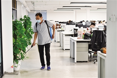 德必园区工作人员每天对园区内门把手、座位、共享大厅等重点触点区域进行消毒,并用消毒剂对公共区域、停车场、垃圾区等高频接触区域进行喷雾式消杀。“我们还安排工作人员对整个园区,包括商户,进行每日消杀,从以前每日2次提升到现在每天4次。”潘晨阳介绍说,“我们园区严格落实疫情防控措施,要求园区的103家企业建立疫情防控台账,包含每日员工体温检测、出入人员信息登记等,并做到每日更新。在园区不同企业的就餐区,我们设置了隔离挡板,实行分流分时分餐。”在员工的疫情防控管理方面,园区工作人员全员接种疫苗。