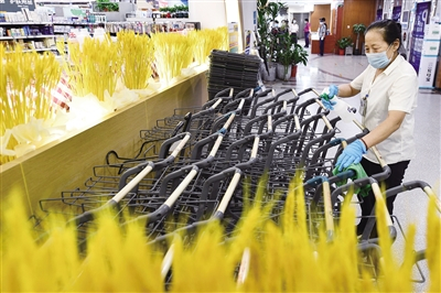 在门口处,记者看到几个员工在对超市玻璃进行擦拭消毒。超市部员工程春林介绍,自上午7点开始,超市的公共区域都要每两个小时消毒一次,并进行记录。