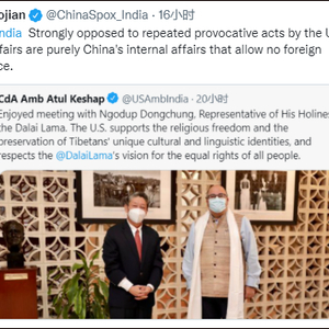 “对于美国一再采取挑衅行动,我表示强烈反对。西藏事务纯属中国内政,任何外国无权干涉。”王小剑在推特@美国驻印度大使馆。