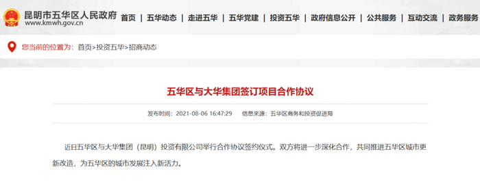 据8月6日昆明五华区政府官网发布的消息,五华区政府与大华集团云南区域公司共同签署了项目开发框架合作协议。据悉,大华集团将投资不少于80亿元,参与五华区的城市更新改造。这意味着大华集团将在五华区城改项目中占有一席之地。