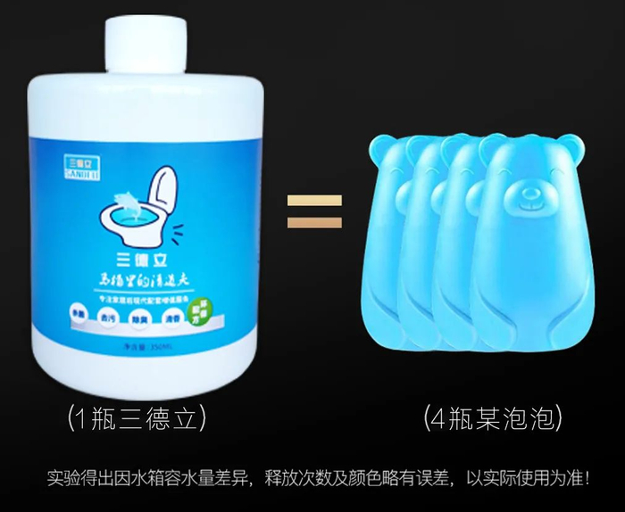 三德立洁厕器,因为释放方式的独特,一瓶就相当于4瓶普通蓝泡泡。使用起来更加节省、更耐用。