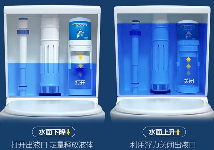 当水面低于洁厕液水位线,出液口打开,洁厕液释放出来;当水面达到洁厕液水位线,出液口关闭。