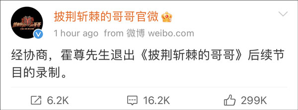 12日18时15分,芒果TV《披荆斩棘的哥哥》节目官方微博宣布:经协商,霍尊先生退出《披荆斩棘的哥哥》后续节目的录制。