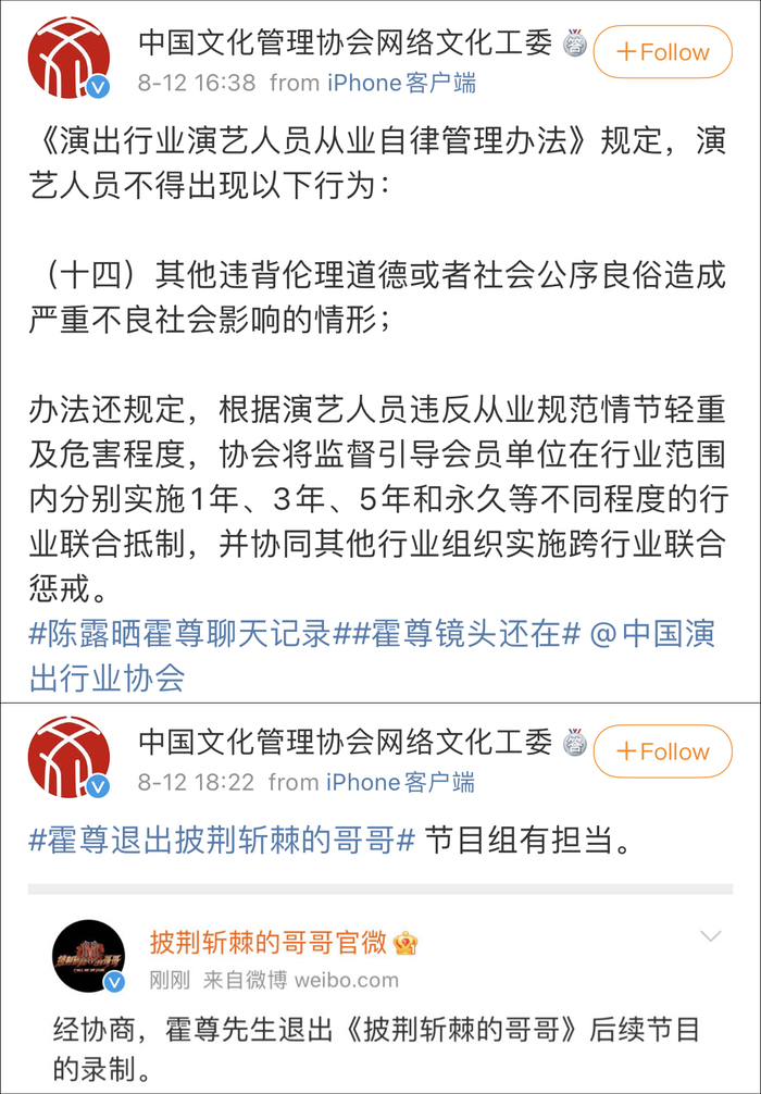 8月12日16时38分,中国文化管理协会网络文化工委官方微博发文,引用《演出行业演艺人员从业自律管理办法》的规定@中国演出行业协会, 指出演艺人员不得出现违背伦理道德或者社会公序良俗造成严重不良社会影响的行为。