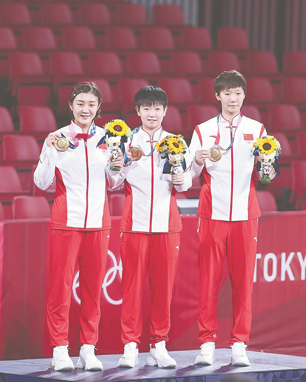 身着安踏冠军领奖服的中国女子乒乓球队选手。新华社发