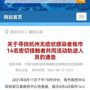 中新网合肥8月13日电 (刘浩)12日晚,安徽省宁国市发布通告,寻找杭州无症状感染者该市14名密切接触者共同活动轨迹人员。