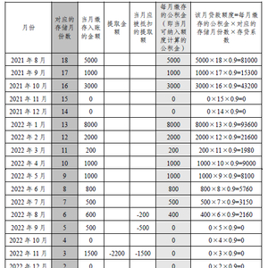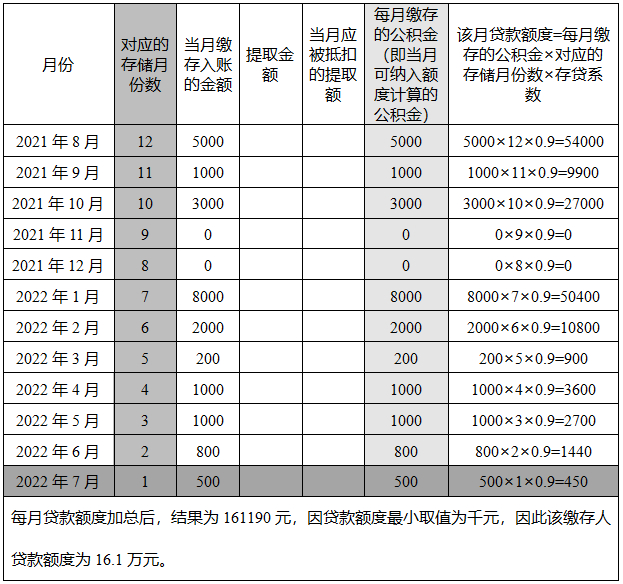 同例,如果是该缴存人在2022年7月申请公积金贷款,那么2022年7月到2021年8月“对应的存储月份数”就分别是1到12。计算结果如下:该缴存人贷款额度为16.1万元。