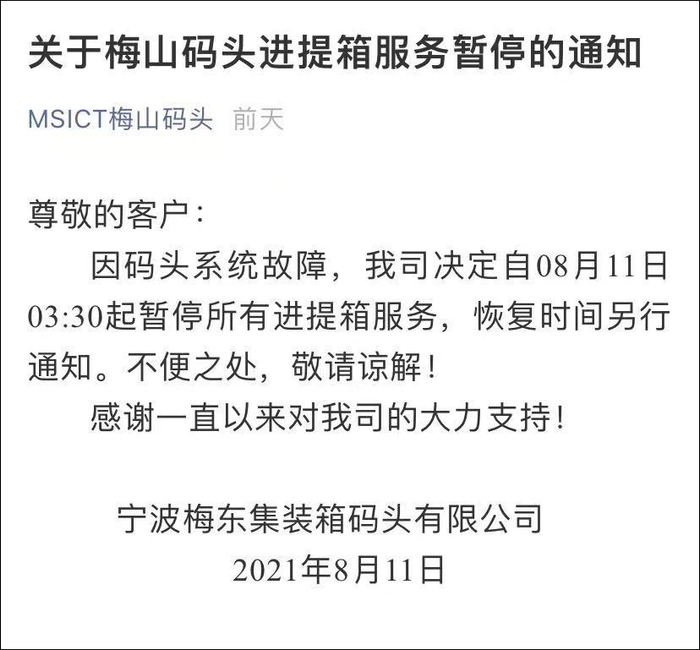 (观察者网讯)8月10日,宁波舟山港码头发现了1例新冠病毒检测呈阳性的工作人员,该名男子工作期间由单位集中闭环管理,居住于梅山港区金创工业园区宿舍。11日,梅山码头发布声明宣布,因码头系统故障,从即日起暂停所有进提箱服务,恢复时间另行通知。