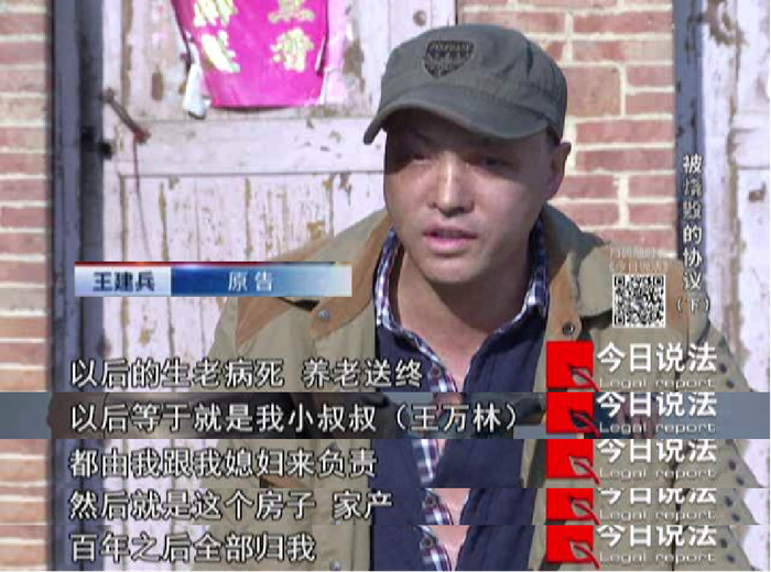 2011年2月,在亲友的见证下,王万林与王建兵签订了一份《承嗣协议》,上面写着王万林认定侄子侄媳王建兵夫妇作为承嗣人,王万林的生老病死以王建兵夫妇为主要责任人,百年后所有遗产由王建兵夫妇继承等内容。因此,王建兵认为,他是过继给王万林的,应是第一顺位的继承人。