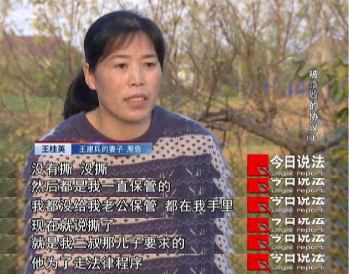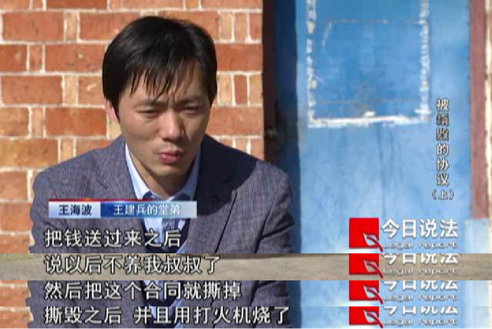 对此王建兵坚决予以否认,王建兵说,清明节那天他只送了钱,并没有撕毁《承嗣协议》,解除承嗣关系需要所有的家族成员在场。之后,王建兵妻子也提供了《承嗣协议》原件。